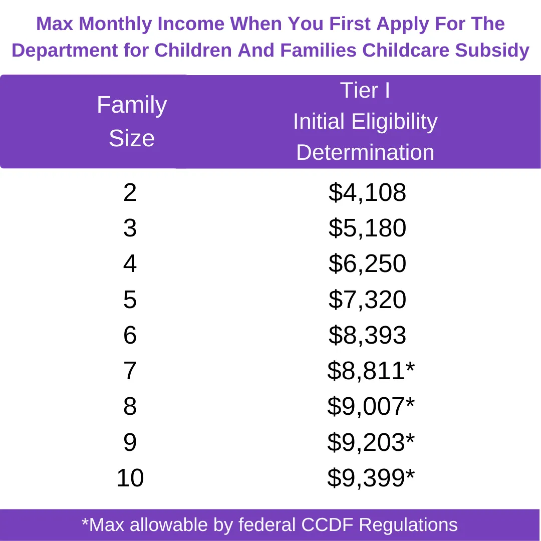 If you make less than what the chart indicates based on your family size, you likely qualify to have most of your childcare tuition covered by DCF!